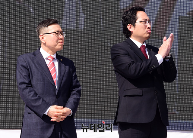 정태옥 자유한국당 의원(왼쪽)과 최대집 대한의사협회장이 25일 오후 국회 정문 앞 도로에서 열린 '교육부 시행령 반대 총궐기대회'에 참석해 박수를 치고 있다.