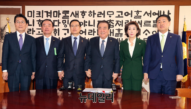 문희상 국회의장과 여야 5당 원내대표가 25일 오전 국회 의장실에서 열린 회동에 앞서 기념사진 촬영을 하고 있다. (왼쪽부터 윤소하 정의당, 장병완 민주평화당, 홍영표 더불어민주당, 문 의장, 나경원 자유한국당, 김관영 바른미래당 원내대표)