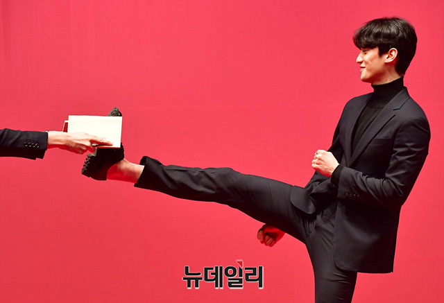 이대훈 선수가 25일 오전 서울 중구 웨스틴조선 호텔에서 열린 '제 24회 코카-콜라 체육대상' 시상식에서 발차기를 선보이고 있다.이번 시상식에는 △최우수선수상 김서영(수영) △우수선수상(비장애인부문) 오연지(복싱), 이대훈(태권도) △우수선수상(장애인부문) 이도연(핸드사이클) △우수단체상 펜싱대표팀 △신인상 조대성(탁구), 여서정(체조) △우수지도자상 김학범 U-23청소년축구대표티 감독 △특별상 여자 카누 용선 대표팀, 故이민혜(사이클) 등 총 7개 부문에 상금과 상패가 수여됐다.코카-콜라 체육대상은 상대적으로 관심과 지원이 부족한 아마추어 스포츠 분야에서 역량 있는 선수를 지원하기 위해 제정한 상으로 모든 아마추어 스포츠 종목을 대상으로 선수의 훈련 과정, 성적, 주위 평가 등을 고려해 월간 MVP를 선정 수상한다.