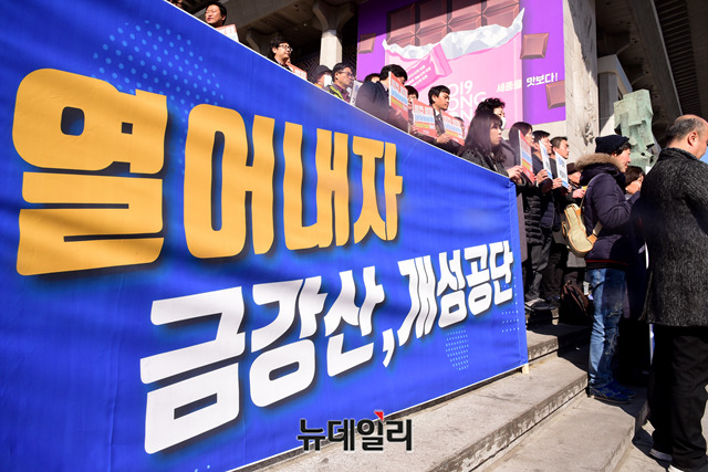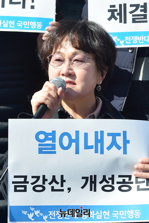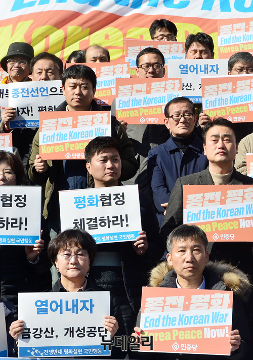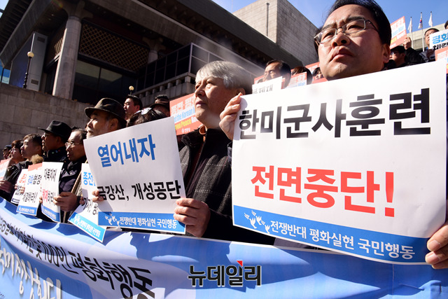 민주노총, 민중당, 전농, 한국진보연대 등 30여개 좌파단체가 26일 오전 서울 종로구 세종문화회관 계단에서 2차 미북정상회담에 바라는 입장 발표를 하고 있다.