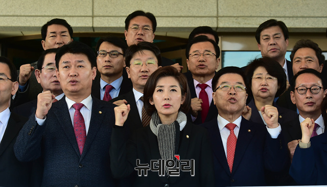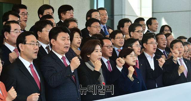 나경원 자유한국당 원내대표와 소속 의원들이 26일 오전 서울 서초동 대검찰청을 항의방문 후 '환경부 블랙리스트 의혹'에 대한 철저한 수사를 촉구했다. 이날 자유한국당 의원들은 문무일 검찰총장 면담을 요청했지만 거부당했다.