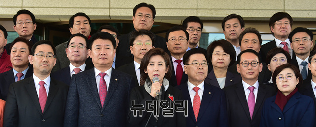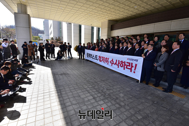 나경원 자유한국당 원내대표와 소속 의원들이 26일 오전 서울 서초동 대검찰청을 항의 방문 후 '환경부 블랙리스트 의혹'에 대한 철저한 수사를 촉구했다. 이날 자유한국당 소속 의원들은 문무일 검찰총장 면담을 요청했지만 거부당했다.