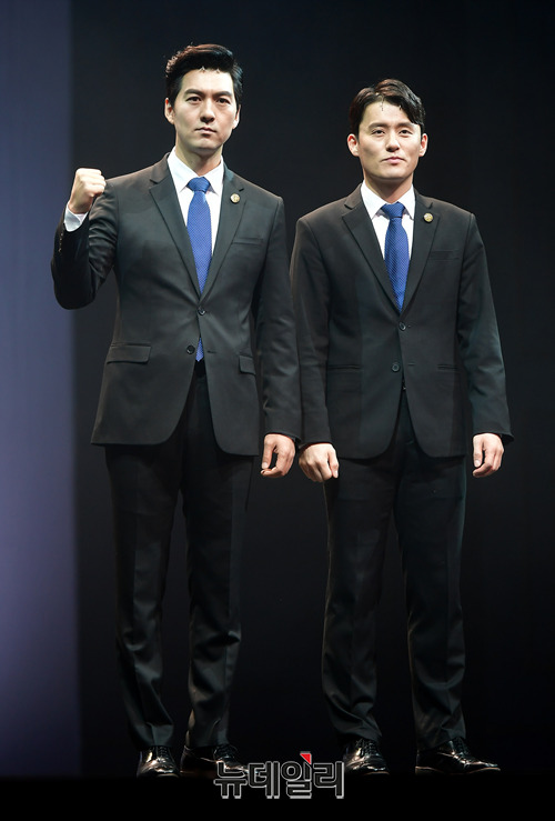 정학 역을 맡은 배우 이필모, 최재웅이 26일 오후 서울 용산구 블루스퀘어 인터파크홀에서 열린 창작 뮤지컬 그날들 프레스콜에서 포토타임을 갖고 있다. 故 김광석의 노래로 만들어진 창작 뮤지컬 그날들은 5월 6일까지 무대에 오른다.