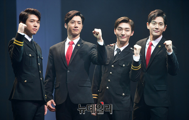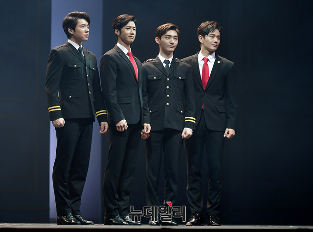 무영 역을 맡은 오종혁, 온주완, 남우현, 윤지성이 26일 오후 서울 용산구 블루스퀘어 인터파크홀에서 열린 창작 뮤지컬 그날들 프레스콜에서 포토타임을 갖고 있다. 故 김광석의 노래로 만들어진 창작 뮤지컬 그날들은 5월 6일까지 무대에 오른다.