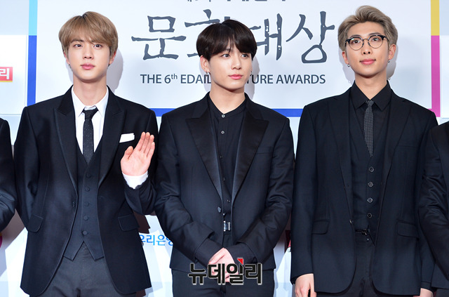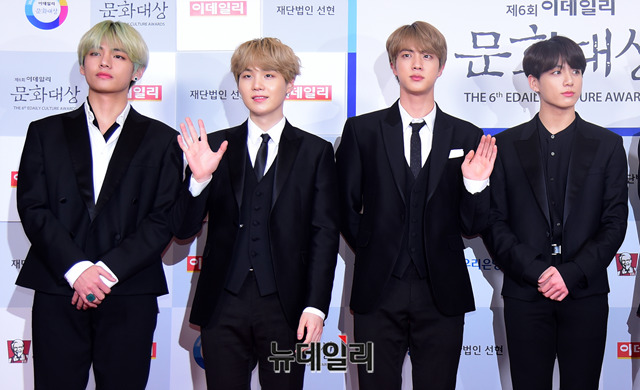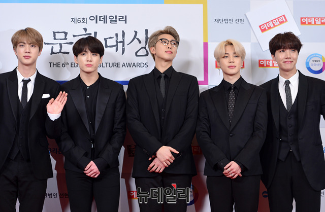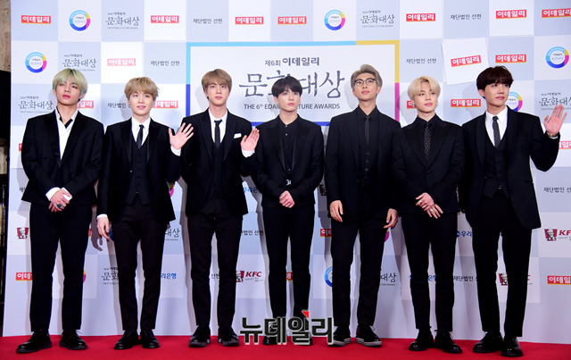 방탄소년단(BTS)이 26일 오후 서울 중구 세종문화회관에서 열린 '이데일리 문화대상' 시상식에 앞서 포토타임을 갖고 있다. 올해 6회를 맞은 '이데일리 문화대상'은 국내외 문화산업 종사자들의 사기진작과 문화산업의 발전을 도모하기 위해 제정한 상이다. 공연예술 전체를 대상으로 대상, 6개 부문별 최우수상, 특별상을 시상한다.