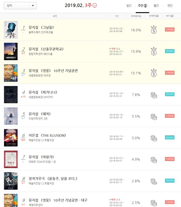 2월 3주 기준(이하 동일)으로 가장 높은 순위는 4월 21일까지 광림아트센터 BBCH홀에서 공연될 '신흥무관학교'다. 27일 개막일이 다가오면서 순위가 전 주 대비 3계단 상승해 인터파크 창작 뮤지컬 분야 2위, 점유율 15.9%를 보였다.