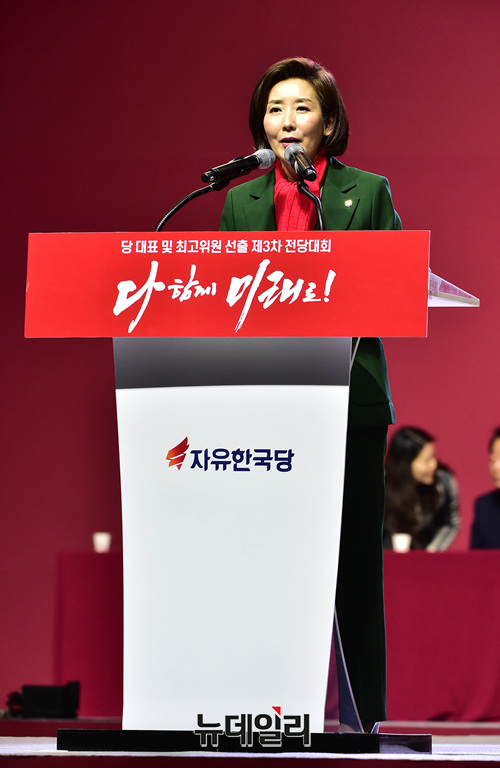 나경원 자유한국당 원내대표가 27일 오후 경기 일산 킨텍스에서 열린 2·27 전당대회에서 인사말을 하고 있다.당대표 후보에는 김진태, 황교안, 오세훈이 나섰다. 최고위원에는 김정희 한국무궁화회 총재, 윤재옥 의원, 윤영석 의원, 김순례 의원, 조대원 경기 고양시정 당협위원장, 김광림 의원, 조경태 의원, 정미경 전 의원 등 8명이 나섰다. 청년 최고위원에는 신보라, 김준교, 이근열, 박진호 등 4명이 이름을 올렸다.이번 전당대회는 선거인단 투표와 국민여론 조사결과, 전당대회 현장에서 진행되는 대의원 투표결과를 합산해 새지도부를 선출한다. 투표결과는 오후 7시 발표 예정이다.