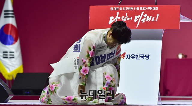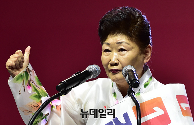 김정희 자유한국당 최고위원 후보가 18일 오후 경기 일산 킨텍스에서 열린 2·27 전당대회에서 지지를 호소하고 있다.당대표 후보에는 김진태, 황교안, 오세훈이 나섰다. 최고위원에는 김정희 한국무궁화회 총재, 윤재옥 의원, 윤영석 의원, 김순례 의원, 조대원 경기 고양시정 당협위원장, 김광림 의원, 조경태 의원, 정미경 전 의원 등 8명이 나섰다. 청년 최고위원에는 신보라, 김준교, 이근열, 박진호 등 4명이 이름을 올렸다.이번 전당대회는 선거인단 투표와 국민여론 조사결과, 전당대회 현장에서 진행되는 대의원 투표결과를 합산해 새지도부를 선출한다. 투표결과는 오후 7시 발표 예정이다.