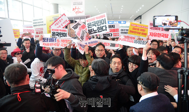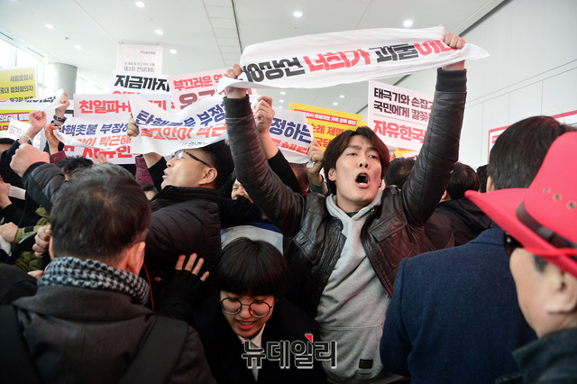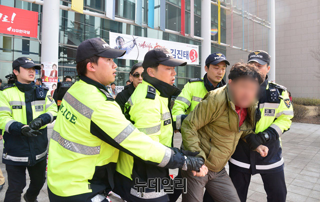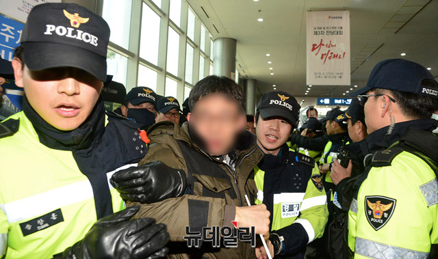 민노총이 27일 오후 경기 일산 킨텍스에서 열린 '자유한국당 2·27 전당대회'에서 기습 시위를 하고 자유한국당 지지자들과 몸싸움을 벌이고 있다. 경찰은 민노총과 한국당 당원들의 충돌을 막기 위해 시위대를 연행하고, 6개 중대 350여 명을 긴급 배치했다. (경기 고양=박성원 기자)
