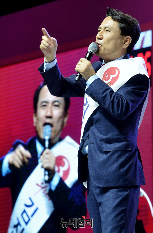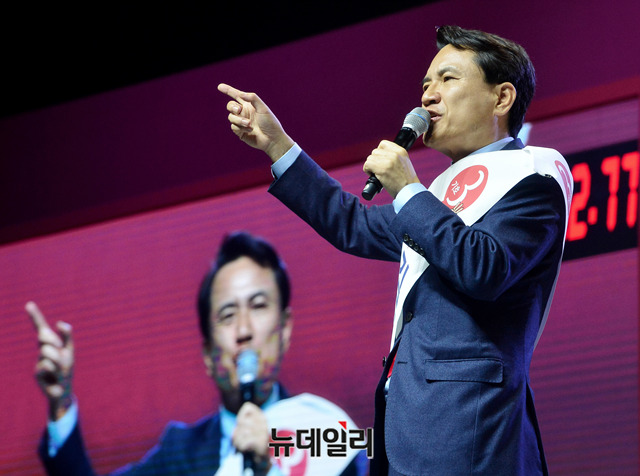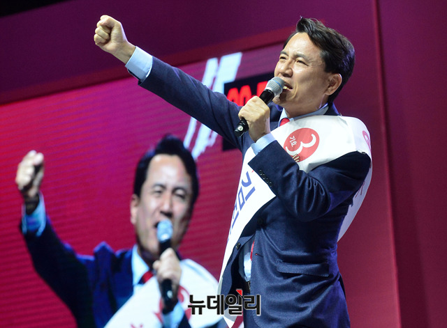 김진태 자유한국당 당대표 후보가 27일 오후 경기 일산 킨텍스에서 열린 2·27 전당대회에서 정견발표를 하고 있다.당대표 후보에는 김진태, 황교안, 오세훈이 나섰다. 최고위원에는 김정희 한국무궁화회 총재, 윤재옥 의원, 윤영석 의원, 김순례 의원, 조대원 경기 고양시정 당협위원장, 김광림 의원, 조경태 의원, 정미경 전 의원 등 8명이 나섰다. 청년 최고위원에는 신보라, 김준교, 이근열, 박진호 등 4명이 이름을 올렸다.이번 전당대회는 선거인단 투표와 국민여론 조사결과, 전당대회 현장에서 진행되는 대의원 투표결과를 합산해 새지도부를 선출한다. 투표결과는 오후 7시 발표 예정이다. (경기 고양=박성원 기자)