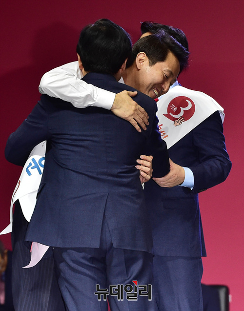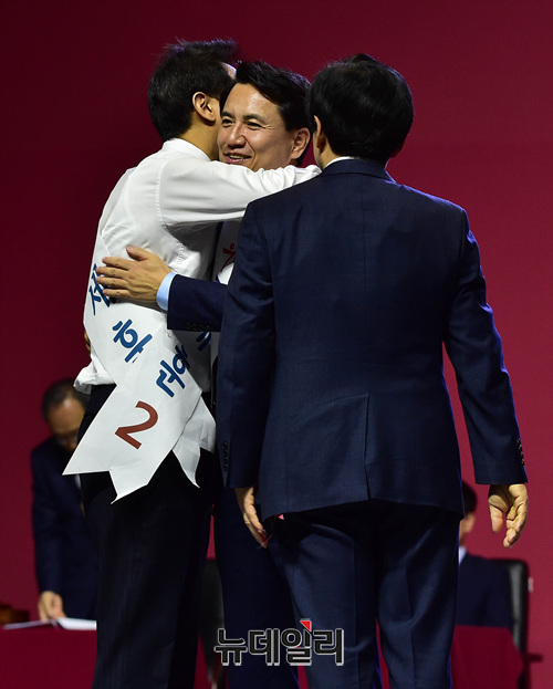 김진태, 오세훈, 황교안 자유한국당 당대표 후보가 27일 오후 경기 일산 킨텍스에서 열린 2·27 전당대회에서 정견발표를 마치고 포옹을 하고 있다.당대표 후보에는 김진태, 황교안, 오세훈이 나섰다. 최고위원에는 김정희 한국무궁화회 총재, 윤재옥 의원, 윤영석 의원, 김순례 의원, 조대원 경기 고양시정 당협위원장, 김광림 의원, 조경태 의원, 정미경 전 의원 등 8명이 나섰다. 청년 최고위원에는 신보라, 김준교, 이근열, 박진호 등 4명이 이름을 올렸다.이번 전당대회는 선거인단 투표와 국민여론 조사결과, 전당대회 현장에서 진행되는 대의원 투표결과를 합산해 새지도부를 선출한다. 투표결과는 오후 7시 발표 예정이다.