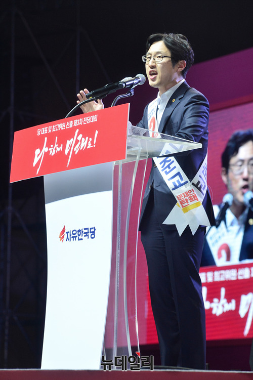 김준교 자유한국당 청년최고위원 후보가 27일 오후 경기 일산 킨텍스에서 열린 2·27 전당대회에서 정견발표를 하고 있다. 투표결과는 오후 7시 발표 예정이다. (경기 고양=박성원 기자)