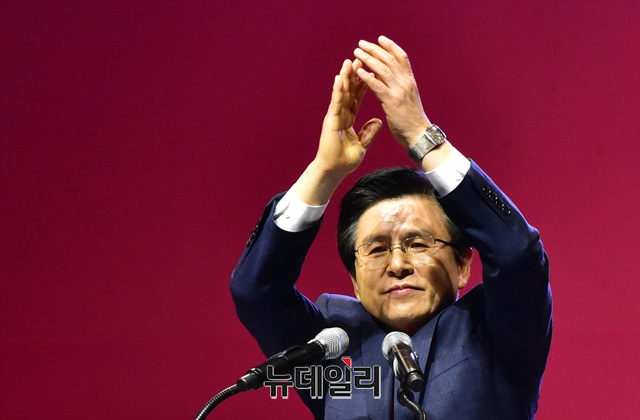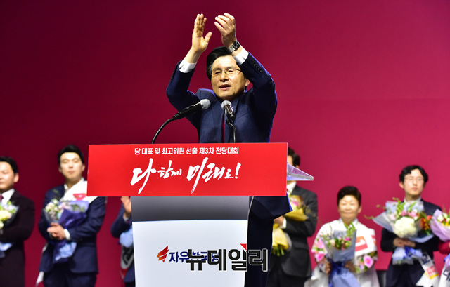 황교안 자유한국당 당대표 후보가 27일 오후 경기 고양시 일산서구 킨텍스 당대표 및 최고위원, 청년최고위원 선출하는 전당대회에서 신임 당대표로 선출된 후 수락연설을 하고 있다.
