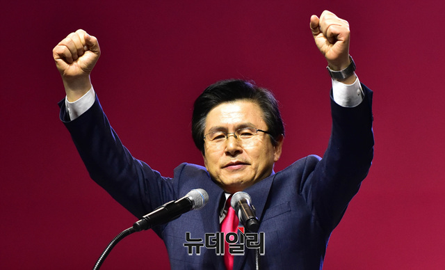 황교안 자유한국당 당대표 후보가 27일 오후 경기 고양시 일산서구 킨텍스 당대표 및 최고위원, 청년최고위원 선출하는 전당대회에서 신임 당대표로 선출된 후 "대한민국 만세"를 외치고 있다.
