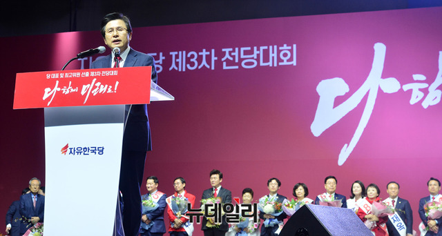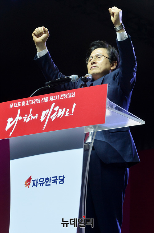 황교안 자유한국당 당대표 후보가 27일 오후 경기 고양시 일산서구 킨텍스 당대표 및 최고위원, 청년최고위원 선출하는 전당대회에서 신임 당대표로 선출된 후 수락연설을 하고 있다.신임 당대표에는 황교안 후보가 6만8,713표를 얻어 당선됐다. 오세훈 후보는 4만2,653표를, 김진태 후보는 2만5,924표를 득표하면서 뒤를 이었다.최고위원에는 조경태, 정미경, 김순례, 김광림 후보가 청년최고위원에는 신보라 후보가 각각 당선 됐다. (경기 고양=박성원 기자)