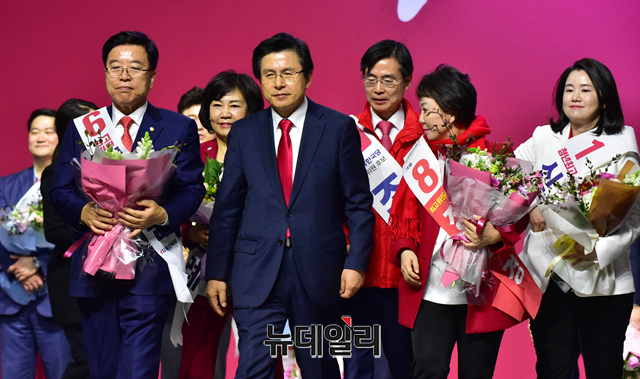황교안 자유한국당 당대표 후보가 27일 오후 경기 고양시 일산서구 킨텍스 당대표 및 최고위원, 청년최고위원 선출하는 전당대회에서 신임 당대표로 선출된 후 최고위원 당선자들과 단상으로 향하고 있다.신임 당대표에는 황교안 후보가 6만8,713표를 얻어 당선됐다. 오세훈 후보는 4만2,653표를, 김진태 후보는 2만5,924표를 득표하면서 뒤를 이었다.최고위원에는 조경태, 정미경, 김순례, 김광림 후보가 청년최고위원에는 신보라 후보가 각각 당선 됐다.