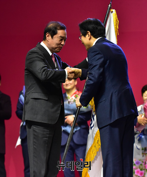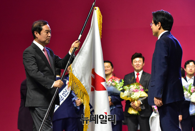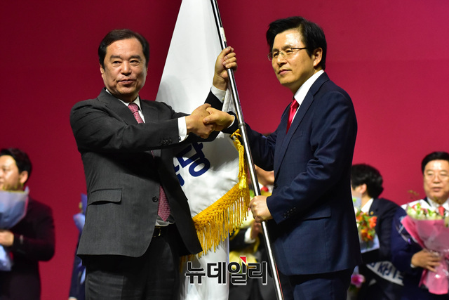 황교안 자유한국당 당대표 후보가 27일 오후 경기 고양시 일산서구 킨텍스 당대표 및 최고위원, 청년최고위원 선출하는 전당대회에서 신임 당대표로 선출된 후 김병준 비대위원장에게 당기를 전달 받고 있다.신임 당대표에는 황교안 후보가 6만8,713표를 얻어 당선됐다. 오세훈 후보는 4만2,653표를, 김진태 후보는 2만5,924표를 득표하면서 뒤를 이었다.최고위원에는 조경태, 정미경, 김순례, 김광림 후보가 청년최고위원에는 신보라 후보가 각각 당선 됐다.