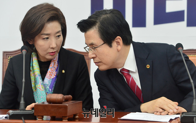 황교안 자유한국당 대표와 나경원 원내대표가 28일 오전 국회에서 열린 최고위원회의에서 대화를 나누고 있다.