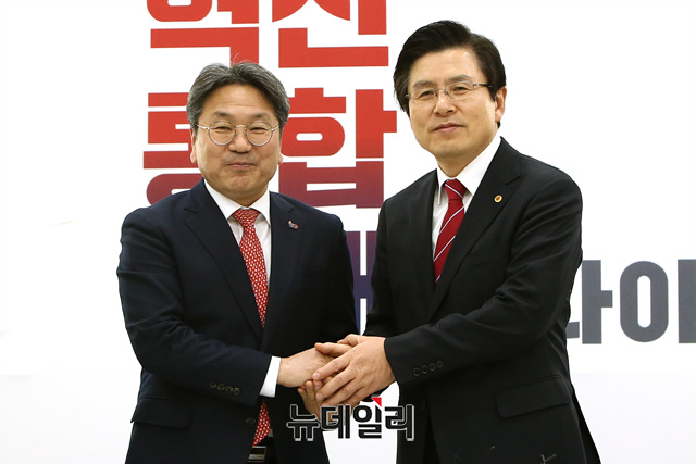 강기정 정무수석이 28일 오후 국회를 찾아 황교안 자유한국당 신임 대표를 예방하고 악수를 나누고 있다.