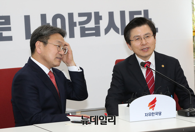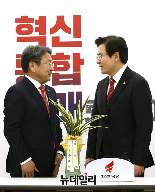 강기정 정무수석이 28일 오후 국회를 찾아 황교안 자유한국당 신임 대표를 예방하고 환담을 나누고 있다.