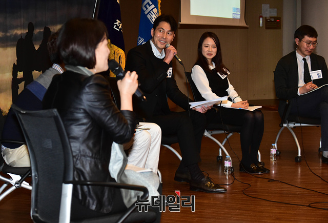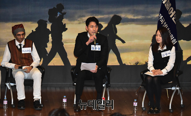 배우 정우성이 28일 오후 국회 도서관에서 열린 더불어민주당 전국청년위원회가 주최 청년정책 토크콘서트 '우리 곁의 난민'에 참석해 발언을 하고 있다.