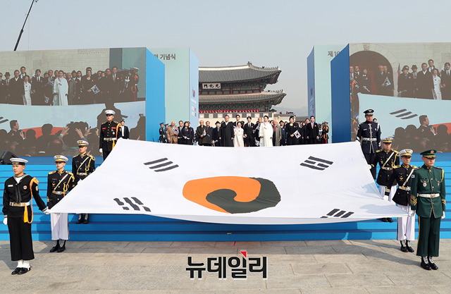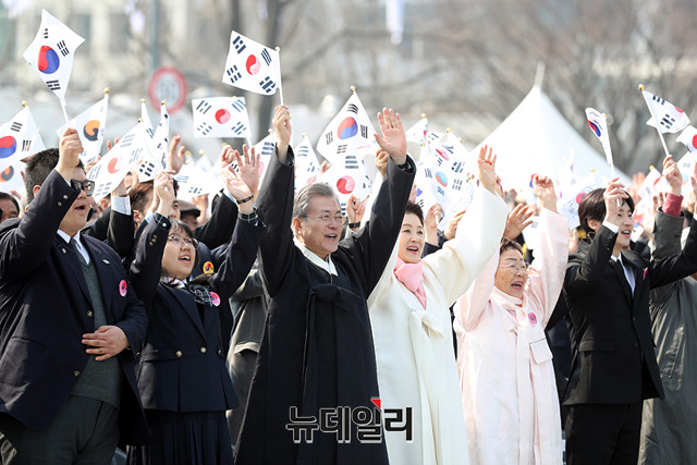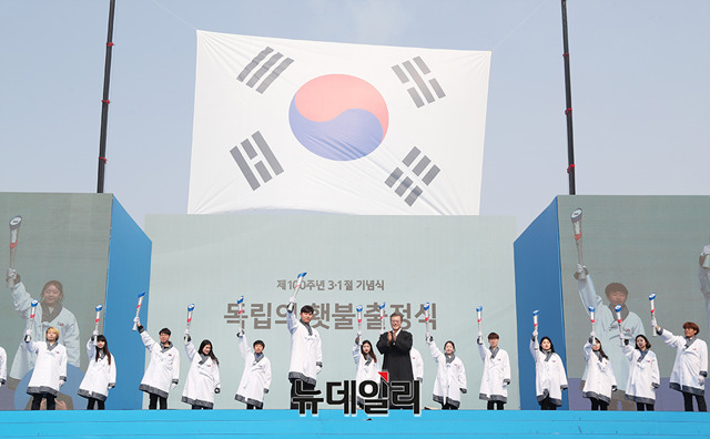 문재인 대통령이 1일 오전 서울 광화문에서 열린 3.1절 100주년 기념행사에서 진관사 태극기를 앞세우고 33인의 시민들과 행사장에 입장하고 있다. (사진=청와대)