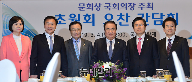 문희상 국회의장 및 5당 대표가 4일 오후 국회 사랑재에서 열린 오찬간담회에서 기념촬영을 하고 있다. (왼쪽부터 이정미 정의당 대표, 손학규 바른미래당 대표, 이해찬 더불어민주당 대표, 문희상 국회의장, 황교안 자유한국당 대표, 정동영 민주평화당 대표)