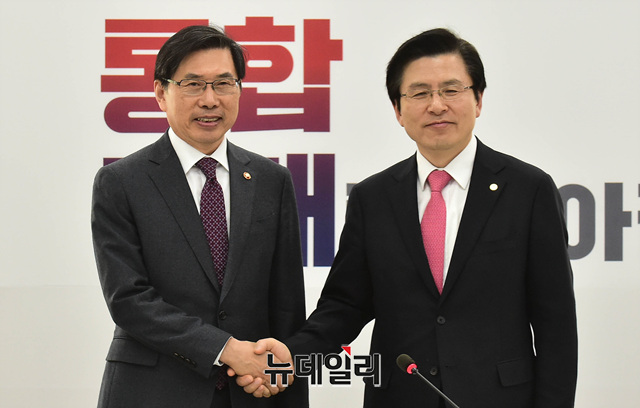황교안 자유한국당 신임 당대표가 4일 오전 국회 당대표실에서 박상기 법무부장관의 예방을 받고 기념사진을 촬영했다.