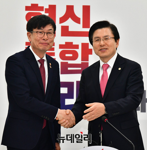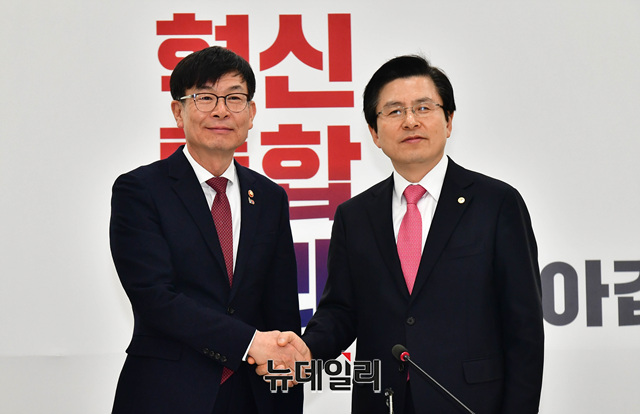 황교안 신임 자유한국당 대표가 4일 오후 국회 당대표실을 예방한 김상조 공정거래위원장과 인사를 나누었다.
