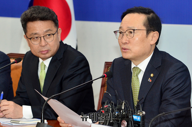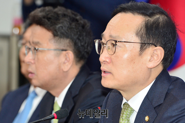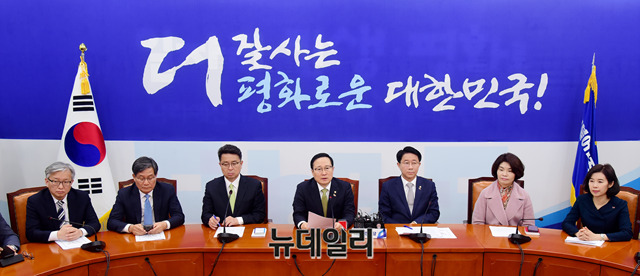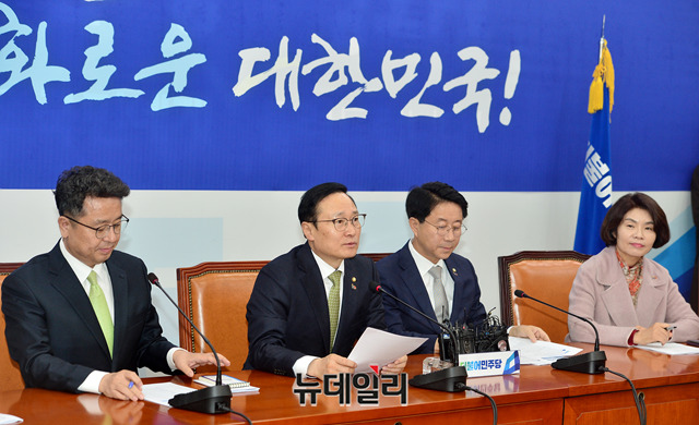 홍영표 더불어민주당 원내대표가 5일 오전 국회에서 열린 원내대책회의에서 모두발언을 하고 있다.