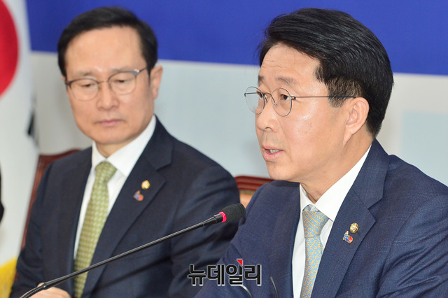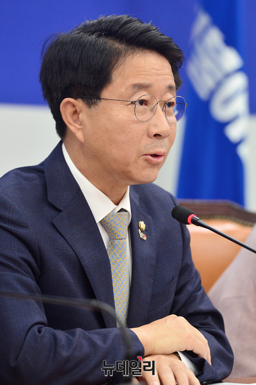 조정식 더불어민주당 정책위의장이 5일 오전 국회에서 열린 원내대책회의에서 모두발언을 하고 있다.