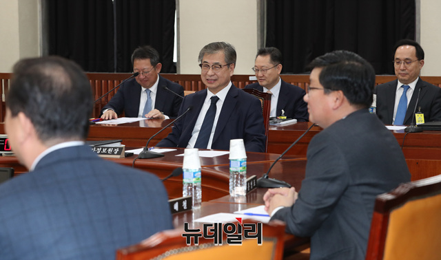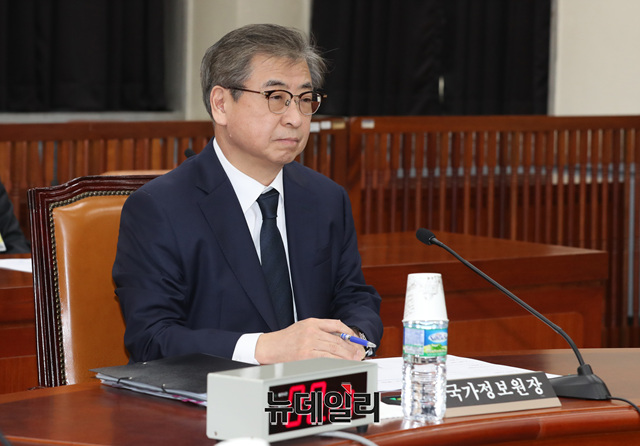 서훈 국가정보원장이 5일 오후 국회에서 열린 정보위원회 전체회의에 출석해 회의 시작을 기다리고 있다.