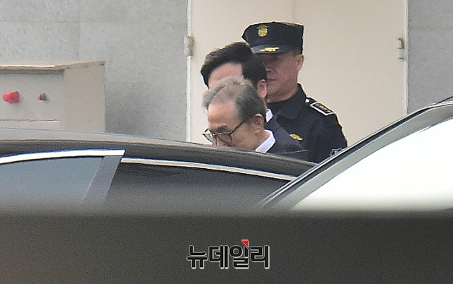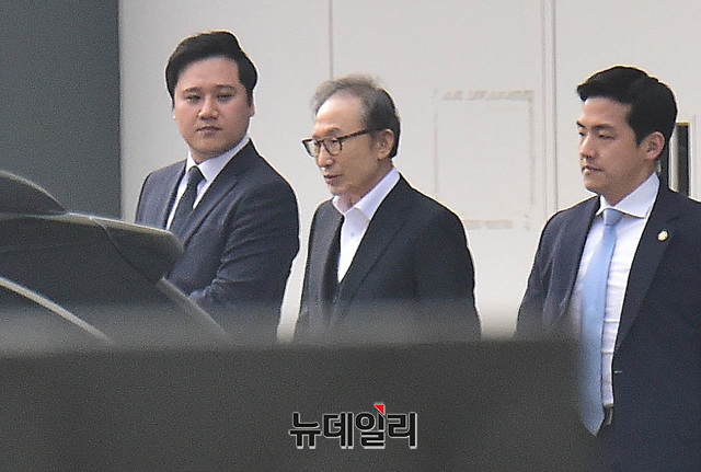 이명박 전 대통령이 구속된 지 349일 만인 6일 오후 서울 송파구 동부구치소를 걸어나와 차량에 탑승하고 있다. 이 전 대통령은 뇌물·횡령 등 혐의로 1심에서 징역 15년을 선고받았으나 항소심에서 보석으로 풀려났다.