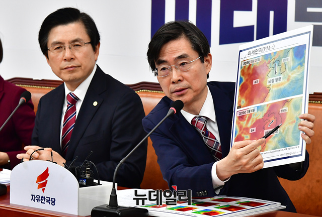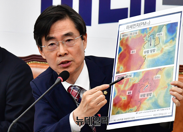 조경태 자유한국당 최고위원이 7일 오전 국회에서 열린 최고위원회의에서 미세먼지 이동 경로와 관련한 발언을 했다.
