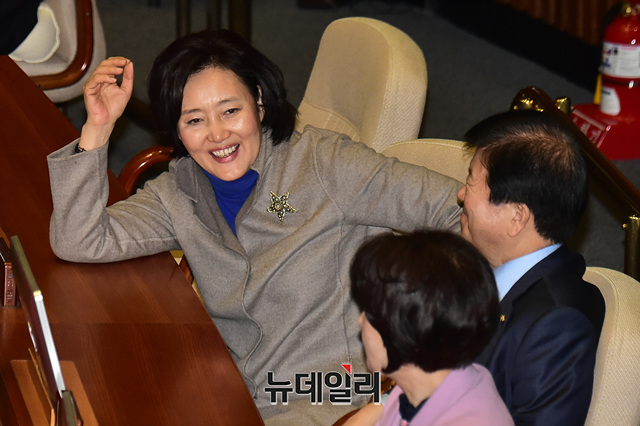 박영선 더불어민주당 의원이 7일 오후 국회에서 열린 제367회 국회(임시회) 제1차 본회의에서 같은 당 소속 박병석, 추미애 의원과 대화를 나누고 있다.