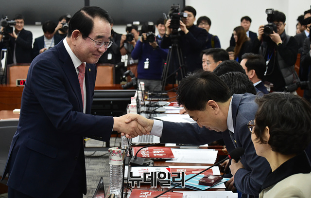 박명재 국회 윤리특별위원회 위원장이 7일 오후 국회에서 열린 전체회의에서 의원들과 악수하고 있다.