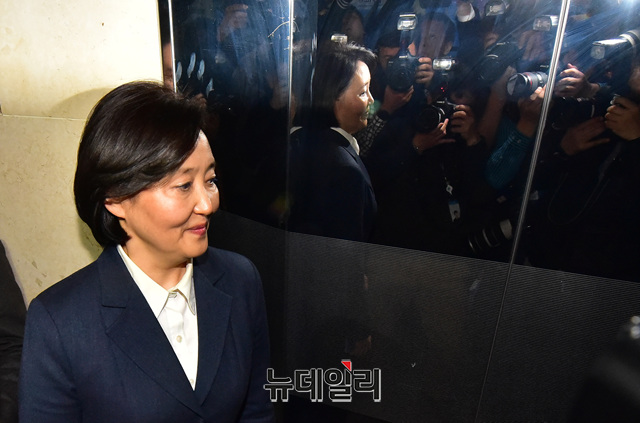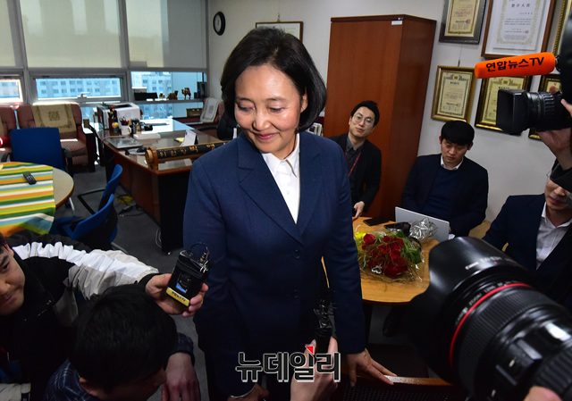 중소벤처기업부 장관으로 지명된 박영선 더불어민주당 의원이 8일 오후 국회 의원회 본인의 사무실에서 소감을 밝힌 후 회관을 떠나고 있다.