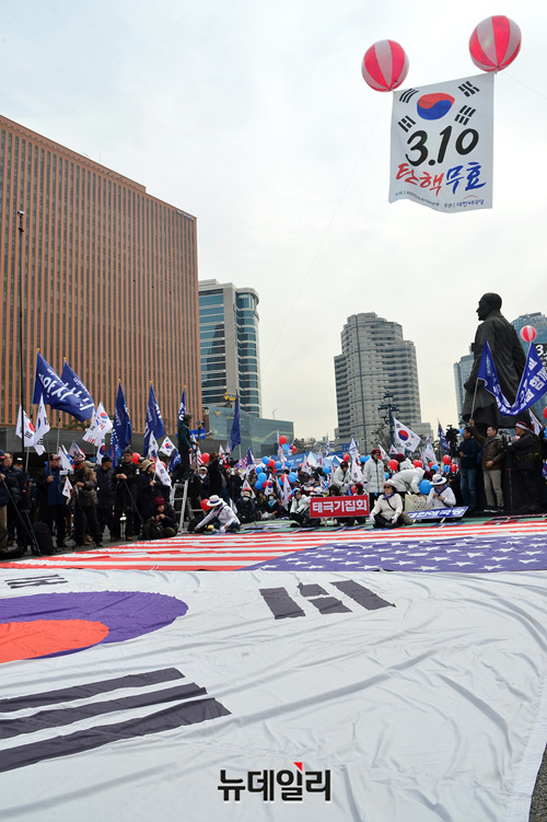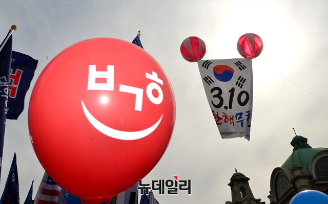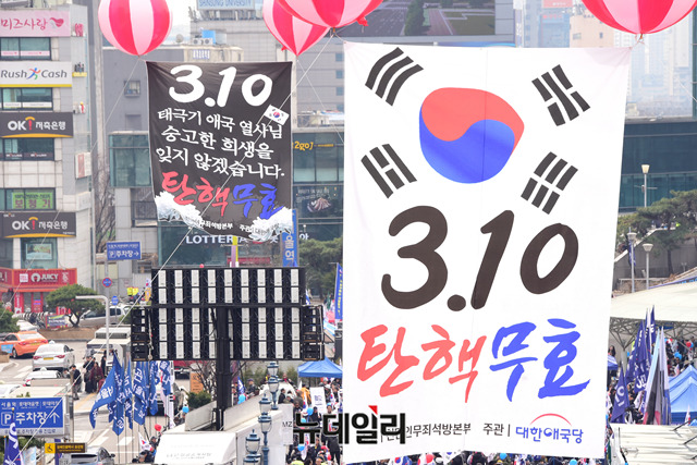 '박근혜 전 대통령 탄핵 2년'을 하루 앞둔 9일 오후 서울역 광장에서 열린 제112차 태극기 집회에 참석한 시민들이 풍선과 피켓을 "박근혜 대통령 탄핵무효"를 외치고 있다.