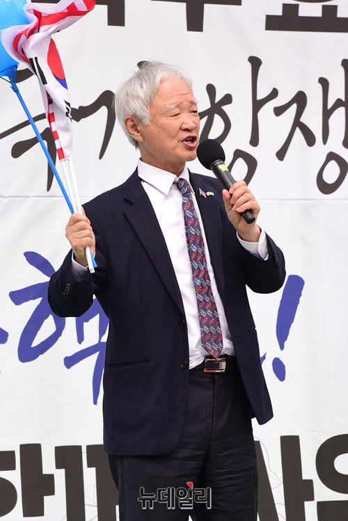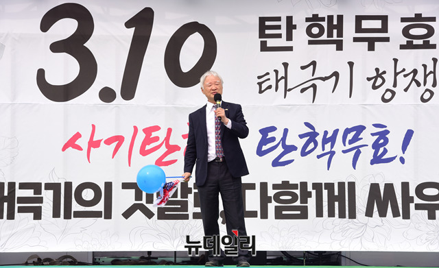 '박근혜 전 대통령 탄핵 2년'을 하루 앞둔 9일 오후 서울역 광장에서 열린 제112차 태극기 집회에 참석한 서석구 변호사가 발언을 하고 있다.