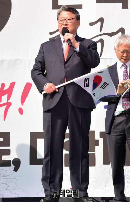 '박근혜 전 대통령 탄핵 2년'을 하루 앞둔 9일 오후 서울역 광장에서 열린 제112차 태극기 집회에 참석한 조원진 대한애국당 대표가 발언을 하고 있다.