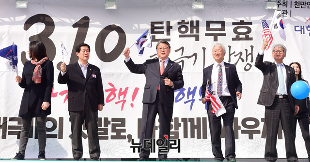 [포토] 조원진 애국당 대표 "박근혜 대통령 탄핵무효"