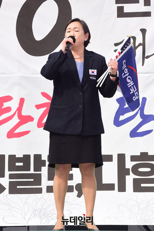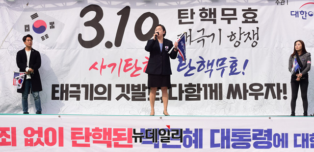 '박근혜 전 대통령 탄핵 2년'을 하루 앞둔 9일 오후 서울역 광장에서 열린 제112차 태극기 집회에 참석한 인지연 대한애국당 수석대변인이 발언을 하고 있다.