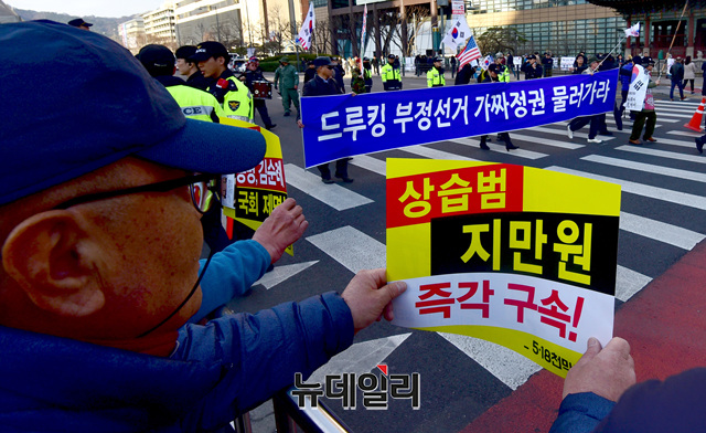 '박근혜 전 대통령 탄핵 2년'을 하루 앞둔 9일 오후 서울 광화문광장 인근에서 열린 제112차 태극기 집회참석자들이 행진하는 중 좌파시민단체가 '지만원 구속' 피켓을 들고 야유를 보내고 있다.