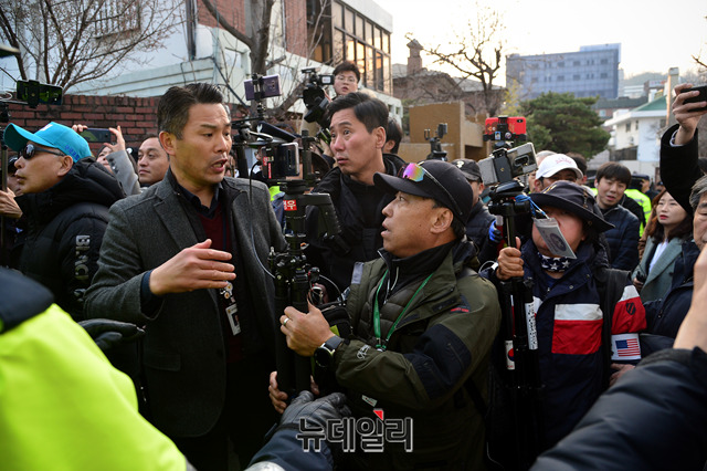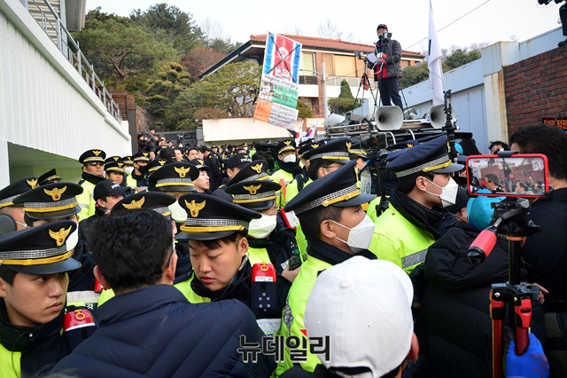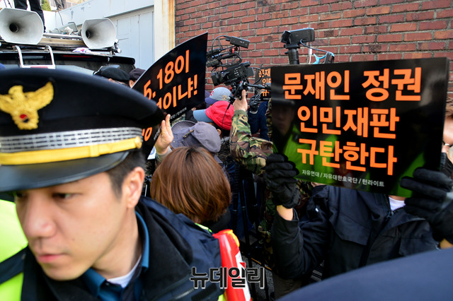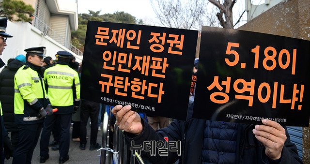 자유연대·자유대한호국단 등 전두환 전 대통령을 지지하는 우파 단체가 11일 오전 서울 서대문구 전 전대통령 자택앞에서 집회를 열고 있다.