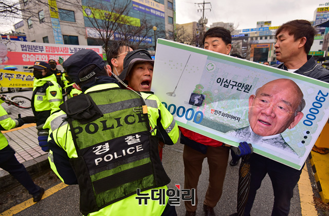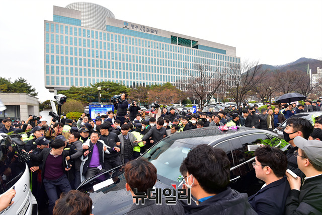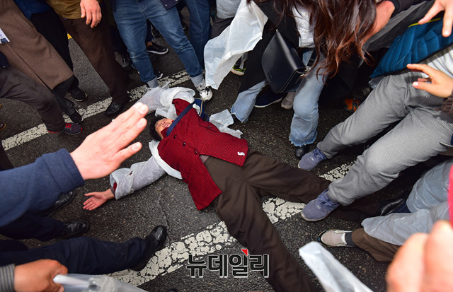 사자명예훼손 혐의로 기소된 전두환 전 대통령이 11일 오후 광주 동구 광주지방법원에서 열린 재판을 마치고 법원을 나서자 한 시민이 누워서 차량 이동을 막고 있다.
