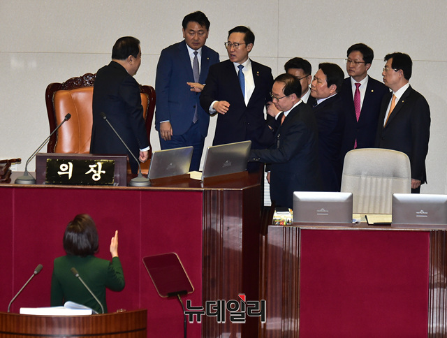 나경원 자유한국당 원내대표가 12일 오전 국회 본회의장에서 열린 교섭단체 대표연설에서 "대한민국의 대통령이 김정은 수석대변인 이라는 소리를 듣지 않도록 해달라"고 발언을 하자 홍영표 더불어민주당 원내대표가 문희상 국회의장에게 항의를 하고 있다.