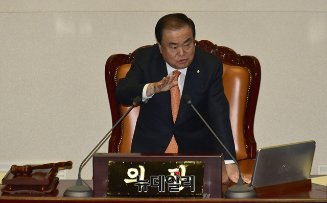 문희상 국회의장이 2일 오전 국회 본회의장에서 열린 교섭단체 대표연설에서 나경원 자유한국당 원내대표의 "대한민국의 대통령이 김정은 수석대변인 이라는 소리를 듣지 않도록 해달라"는 발언이 문제가 되자 여야 의원들의 자제를 요구하고 있다.
