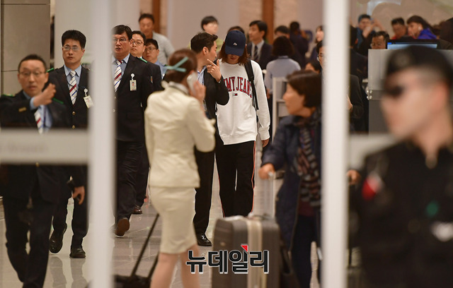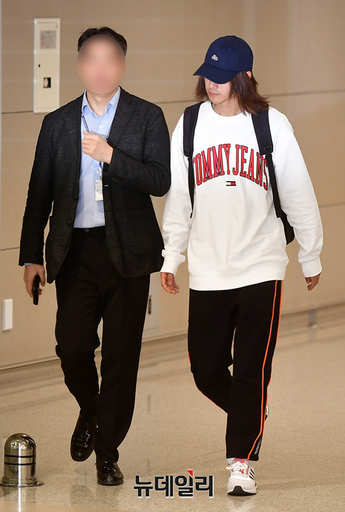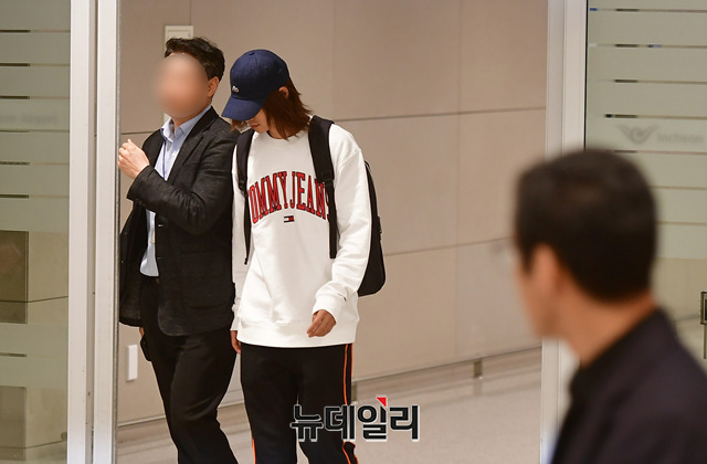 불법으로 성관계 영상을 찍어 유포한 의혹을 받고 있는 가수 정준영이 12일 오후 인천국제공항을 통해 입국하고 있다. 정준영은 13일 서울지방경찰청 광역수사대에 출석해 경찰 조사를 받을 예정이다. (인천=정상윤 기자)