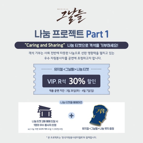 창작 뮤지컬 '그날들'이 '나눔 프로젝트'를 펼친다.제작사 인사이트엔터테인먼트는 "관객의 뜨거운 성원에 보답하고자 공연기간 중 나눔 프로젝트의 첫 번째 프로그램 'Caring and Sharing' 나눔 티켓을 런칭한다"고 13일 밝혔다.이번 나눔 티켓은 한국자원봉사센터협회와 연계해 진행하는 것으로 3월 26일~4월 7일 공연을 예매할 수 있다. 해당 기간에 판매된 티켓 매수에 따라 서울, 경기, 인천 지역의 우수봉사자를 초청해 무료로 공연을 관람할 수 있는 기회를 제공한다.관객이 구매한 나눔 티켓(VIP석, R석 30% 할인)이 2매에 도달하면 우수봉사자 1명에게 무료 공연 관람 기회를 줌으로써 공연관람을 통해 자연스럽게 '나눔 프로젝트'에 함께 참여하게 된다. 또, 예매자 전원에게는 '그날들' 나눔 프로젝트 배지를 선물한다.