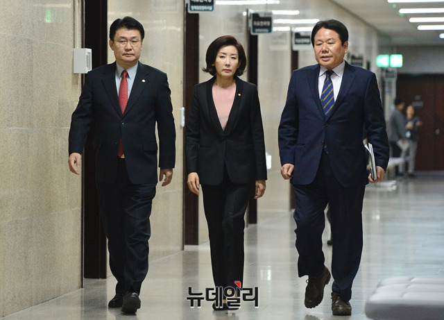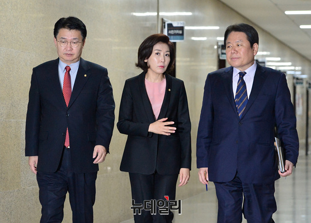 나경원 자유한국당 원내대표, 정용기 정책위의장, 정양석 원내수석부대표가 13일 오전 국회에서 열린 원내대표·중진의원 연석회의에 대화를 나누며 입장하고 있다.